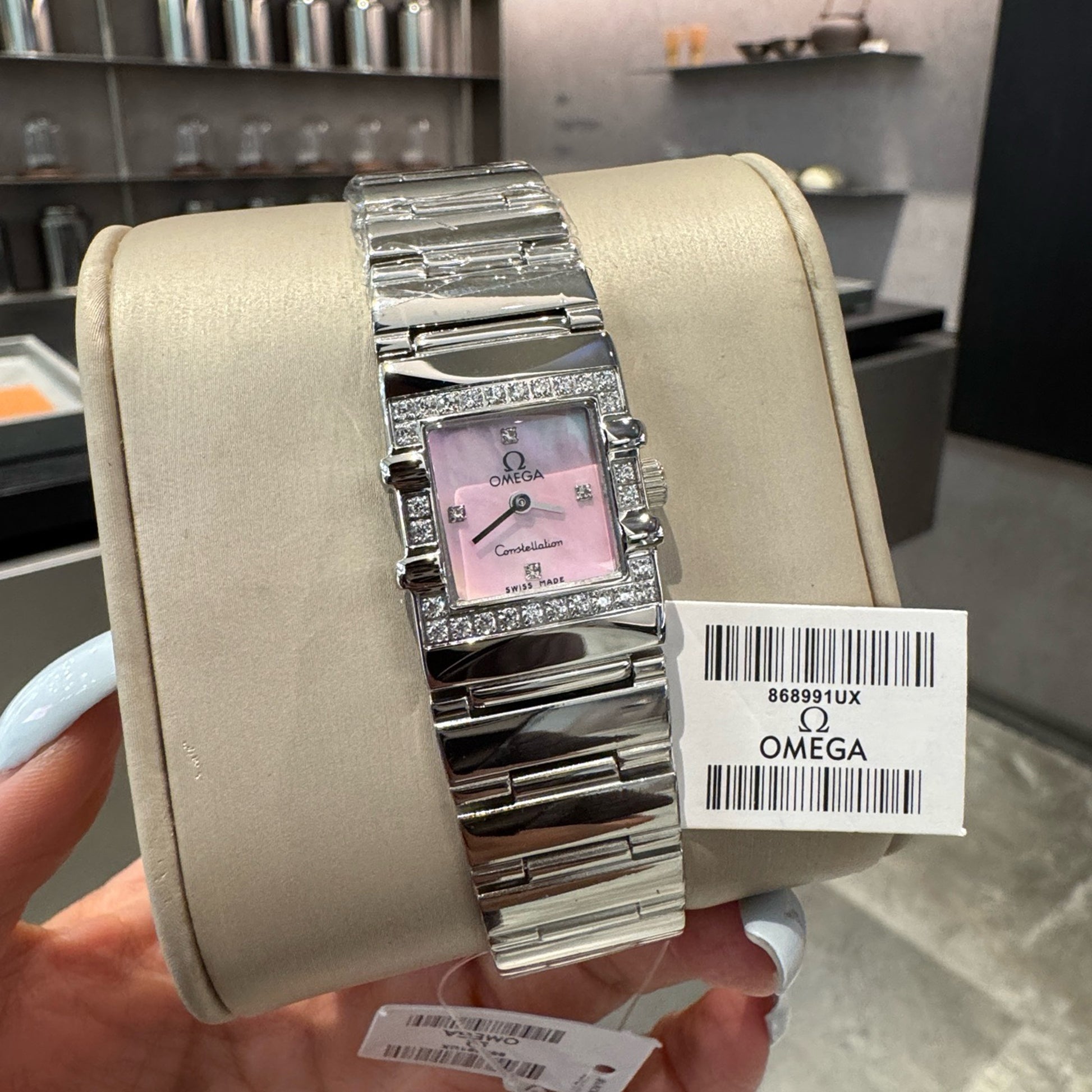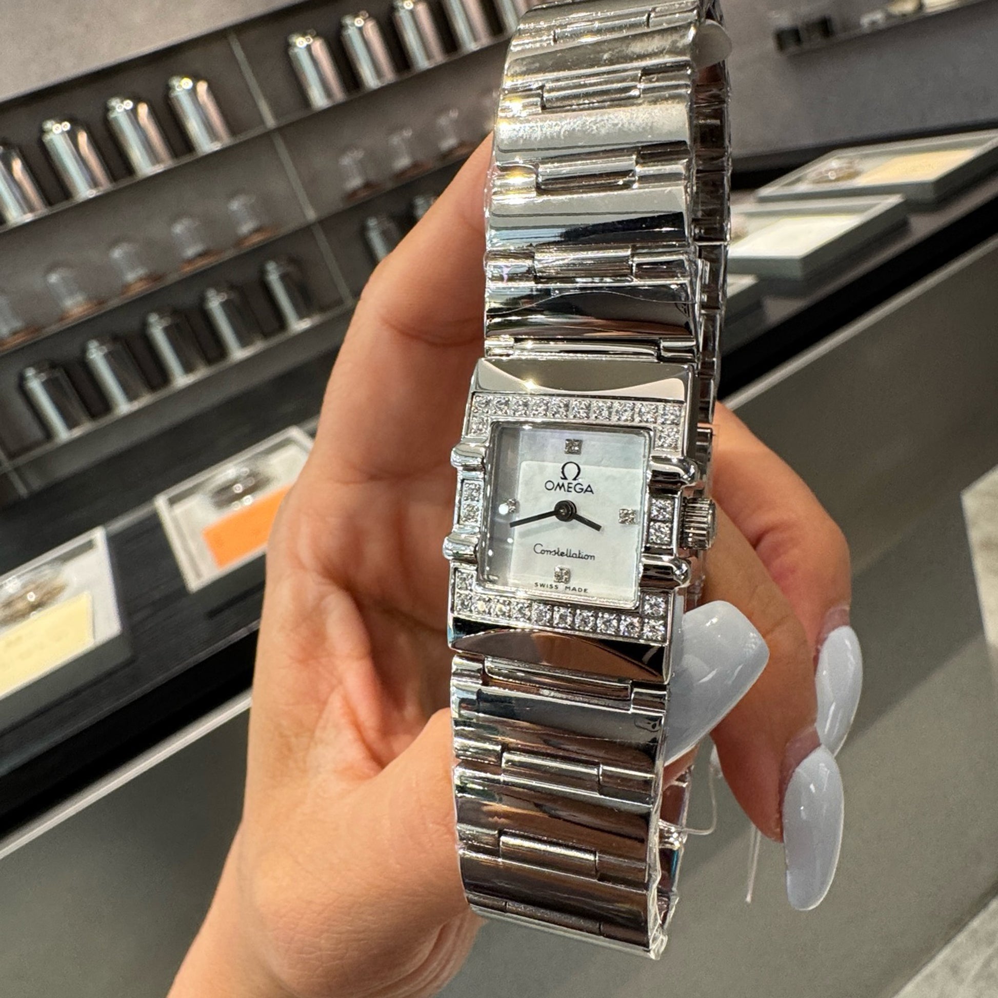 ◆ The full diamond-set bezel elevates its elegance, complemented by a mother-of-pearl dial for a refined and fresh aesthetic.